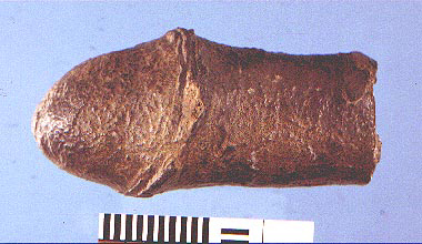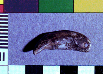Fig. 6. One of the two oldest pendants known in the world, a perforated wolf's canine from Repolusthöhle in Austria, c. 300,000 years old (Bednarik 1992).