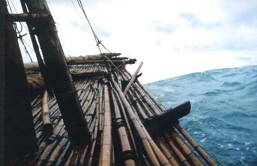 Fig. 3. Palaeolithic seafaring experiment. This bamboo raft was built with stone tools and sailed across the Timor Sea in December 1998 (Bednarik 2003c).